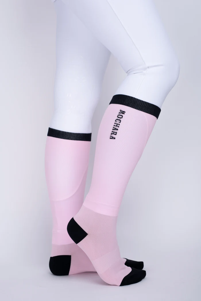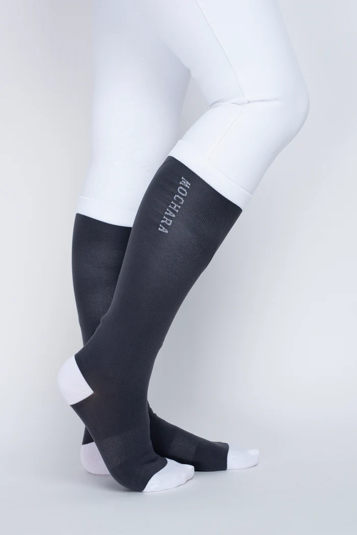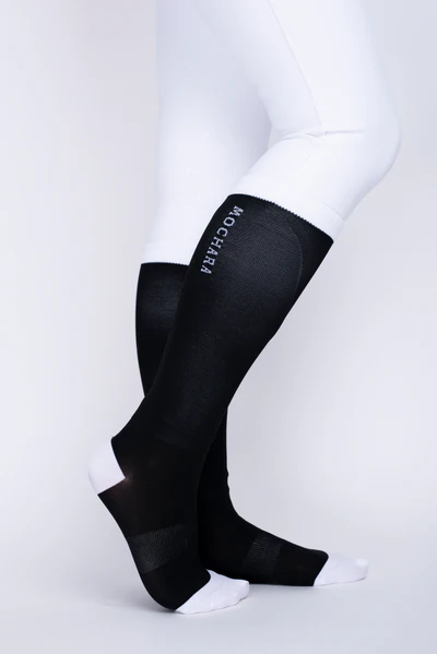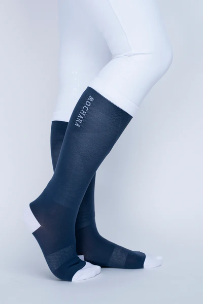 The Mochara knee-high long horse riding socks have been developed for performance. Designed with a super soft stretch sock with reinforced heel and arch compression for ultimate comfort and a lightweight leg material to reduce bulk under your riding boots. These socks are perfect for equestrian competition or everyday horse riding.